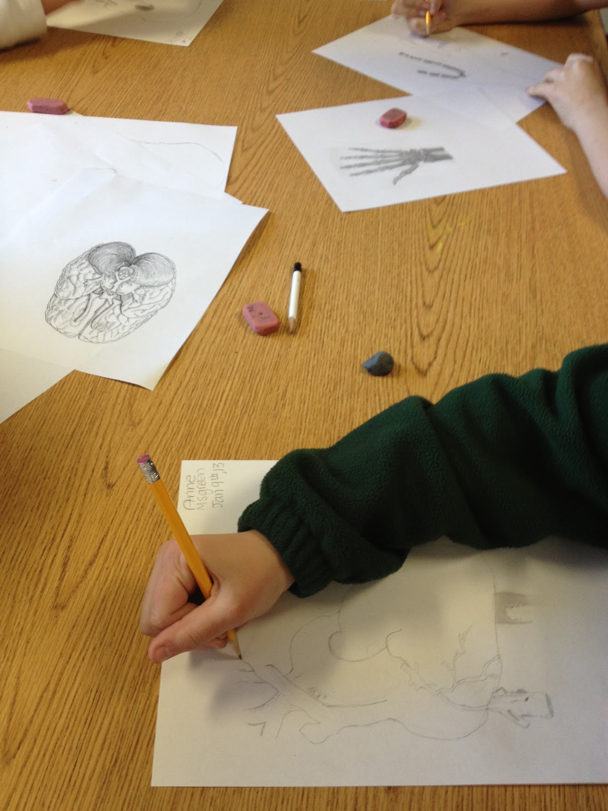 Middle school artists started the week back with medical illustration. Medical illustration is an art career that people do not often think about. Many of our doctors and medical professional rely on drawn images to learn about the different parts of the body. Students each drew a different part of the body, pretending to be a medical illustrator. I was extremely impressed with the quality of the these drawings.